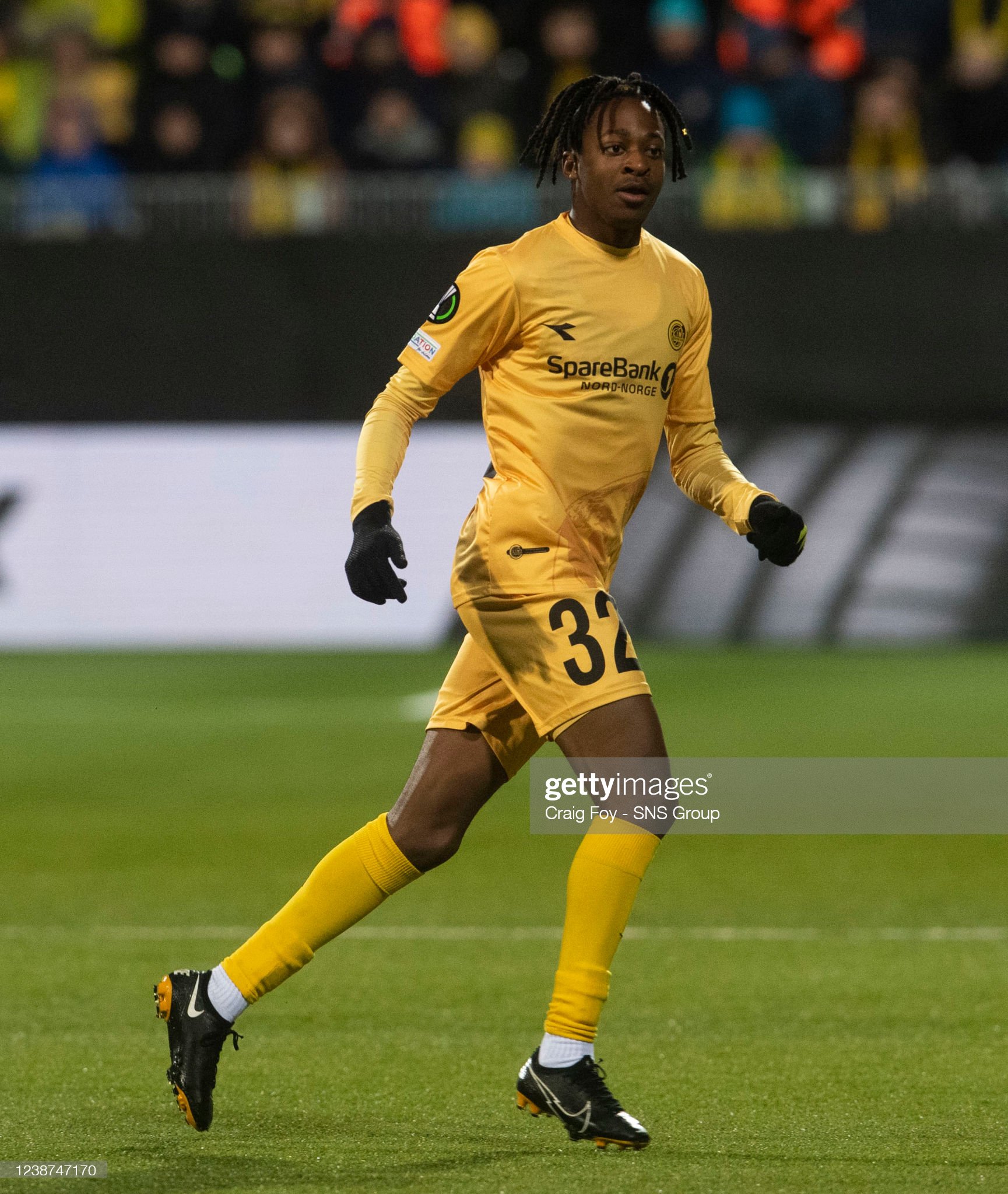 BODO, NORWAY – FEBRUARY 24: Joel Mugisha in action for Bodo/Glimt during a UEFA Conference League Play Off second leg match between Bodo/Glimt and Celtic at the Aspmyra Stadion, on February 24, 2022, in Bodo, Norway. (Photo by Craig Foy/SNS Group via Getty Images)