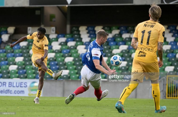 BELFAST, NORTHERN IRELAND - JULY 19: Joel Mvuka of Bodo/Glimt shoots during the UEFA Champions League Second Qualifying Round First Leg match between Linfield and Bodo/Glimt at Windsor Park on July 19, 2022 in Belfast, Northern Ireland. (Photo by Charles McQuillan/Getty Images)