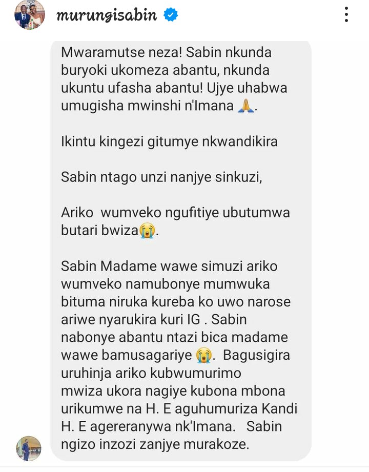 Kuri ubu yongeye yandikirwa nundi nawe amubwira ko umugore we agiye kuzicwa n’abantu batazwi, ati ariko kuko agira ubuntu n’ineza akazahumurizwa na Nyakubahwa Perezida wa Repubilica.