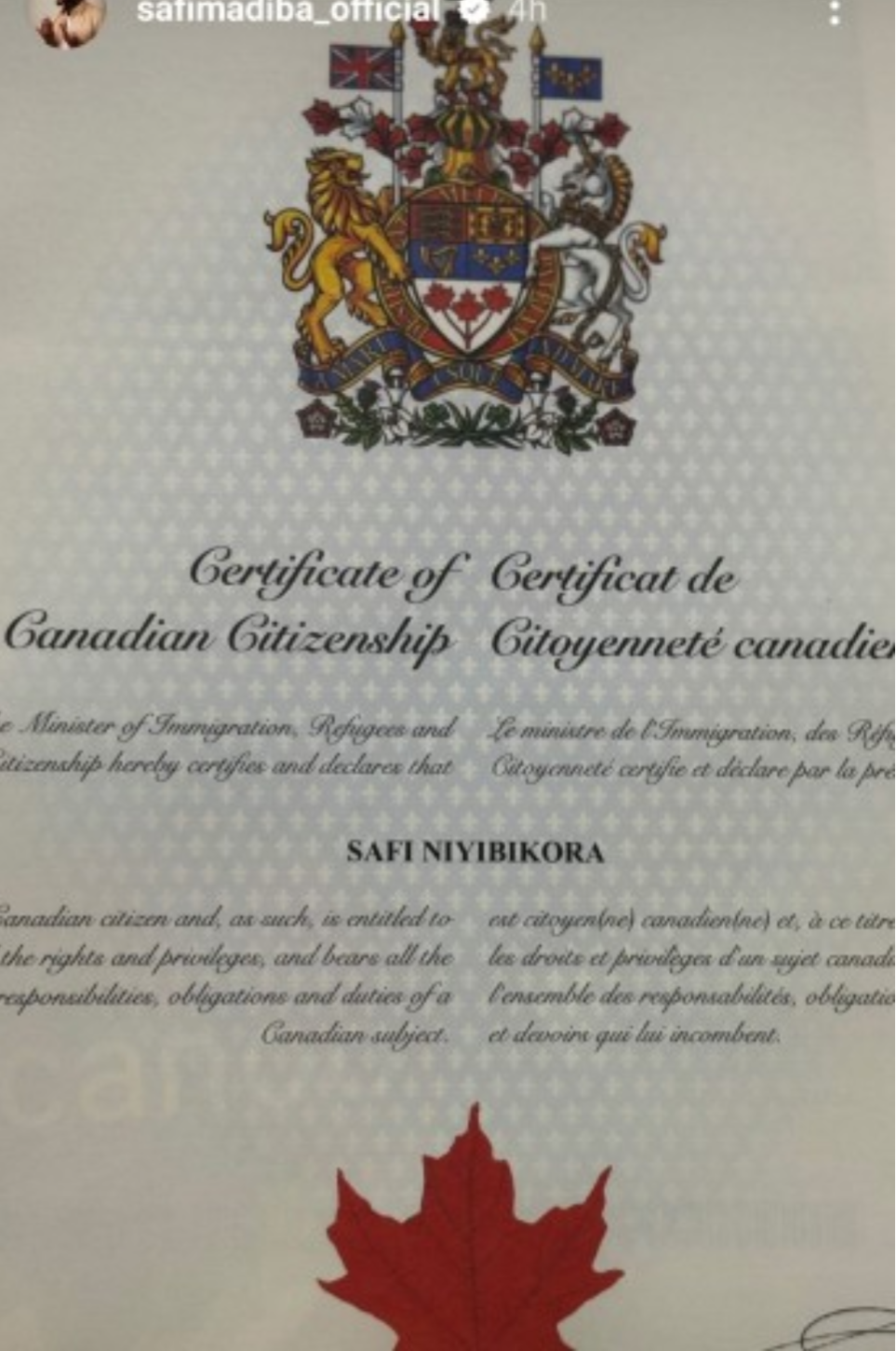 Abinyujiji ku rukuta rwe rwa Instagram, yasohoye urupapuro rugaragaza ko yabaye umwenegihugu wa Canada, guhera kuri uyu wa Mbere tariki 17 Kamena 2024.