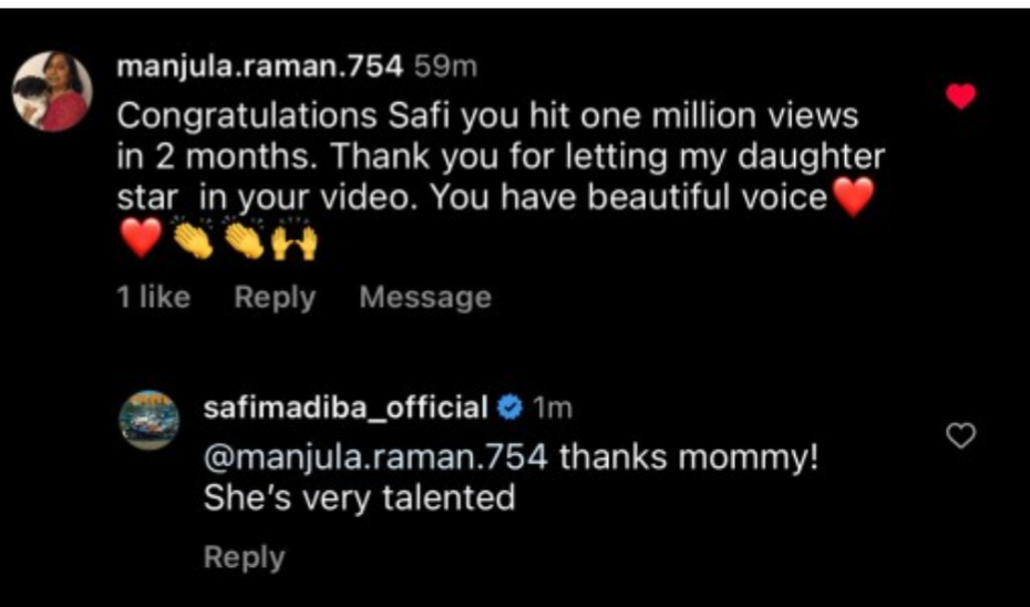 Manjula Rama umubyeyi wa Danica Safi Madiba yifashishije mu mashusho y’indirimbo Fame, yashimiye byimazeyo uyu muhanzi ku bw’uko iyi ndirimbo yujuje miliyoni