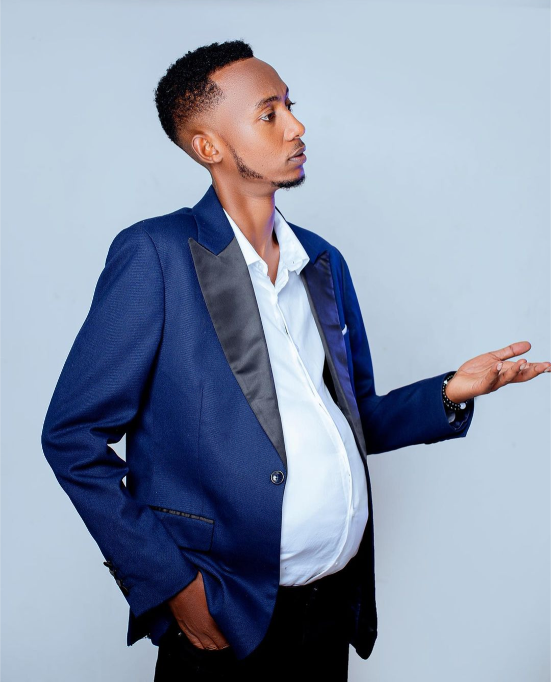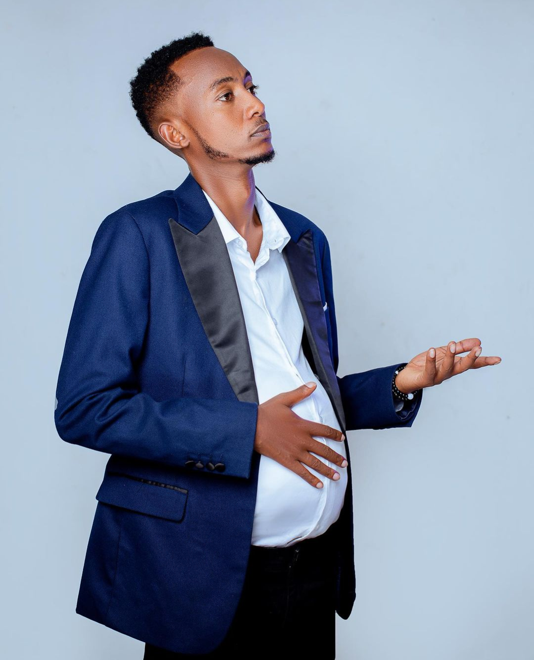 Abinyujije kurukuta rwe rwa Instagram yashyizeho amafoto yambaye ishati ndetse n’ikoti bya kositimu maze yifoza ameze nk’umuntu utwite ubona ko inda ye yabaye nini.
