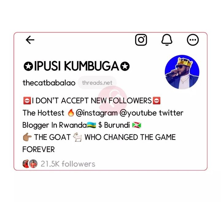 Kugeza ubu Shaddyboo niwe ukurikiranwa n’abantu benshi ku rubuga rwa Threads, aho akurikiranwa n’abarenga ibihumbi 30, umuhanzi bruce Melodie agakurikiranwa n’inihumbi 20.7, mu gihe The Catbabalao wamamaye ku mbuga nkoranyambaga akurikiranwa n’ibihumbi 21.5.