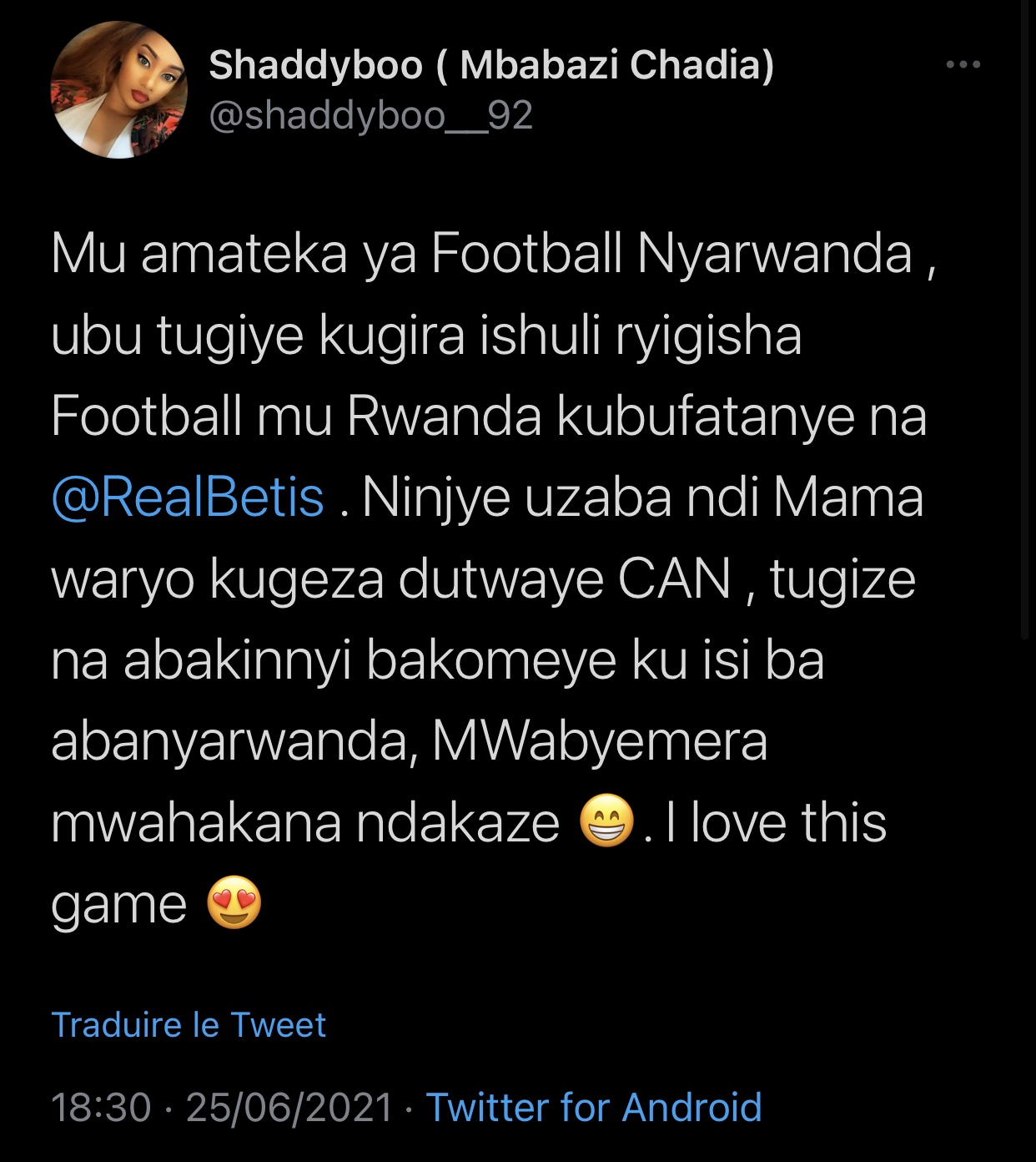 Mbabazi Chadia wamamaye ku izina rya Shaddyboo ari naryo akoresha ku mbuga nkoranyambaga yamaze gutangaza abinyujije kuri Twitter ye ko kuri ubu mu Rwanda hagiye kuza ishuri ryigisha Football rizakora ku bufatanye n’ikipe ya Real Betis yo muri Espagne. Yongeyeho ko azaba na Mama waryo kugeza u Rwanda rutwaye CAN.