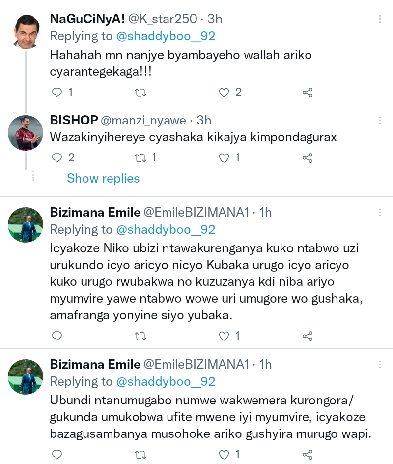 Umwe yagize ati:”Ntukishongore kuberako ufite uburanga bwiza .maze ugirengo urinamwiza murukundo hoya sikobiri urukundo rugira igitsina gabo ujye unasoma bible umenye abo bagabo uvuga ko ukunda nuburyo bwokubambura imitungo yabo kuberako uyobowe nasekibi🤭🤭”