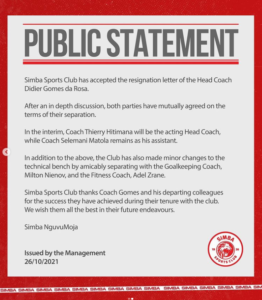 Nyuma yo kutabasha kugeza ikipe ya Simba SC ikomeye muri Tanzaniya, ubuyobozi bwiyi kipe bwahise bufata umwanzuro wo kukwirukana umutoza wayo mukuru Didier Gomez nkuko bigaragara mwibaruwa bashyize hanze kuruyu wa kabiri tariki 26 zukwa cumi 2021.
