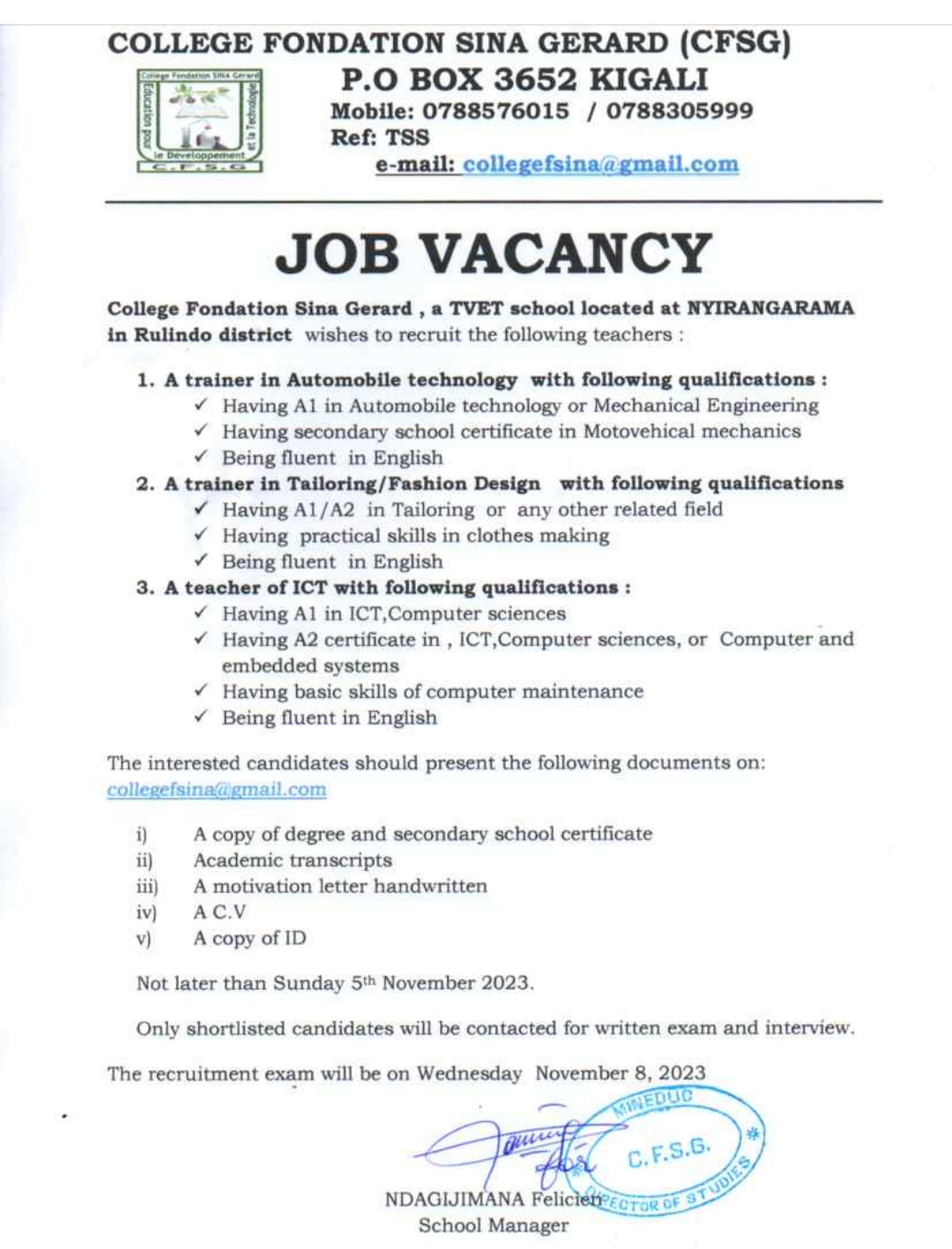 Ni akazi ko kwigisha abanyeshuri bo mu ishuri rye rya College Foundation Sina Gerard TVET School.