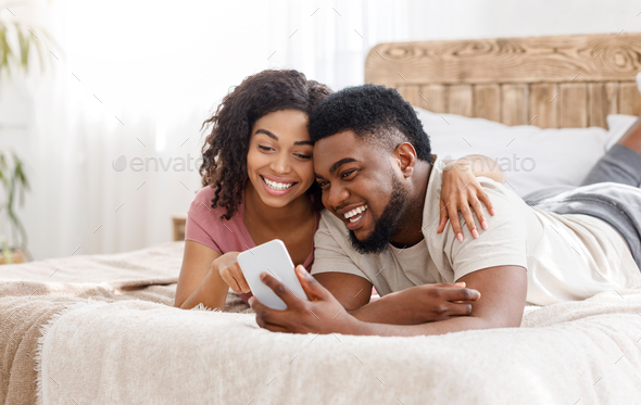 Happy african american couple using smartphone together in bed, watching funny content, free space, panorama