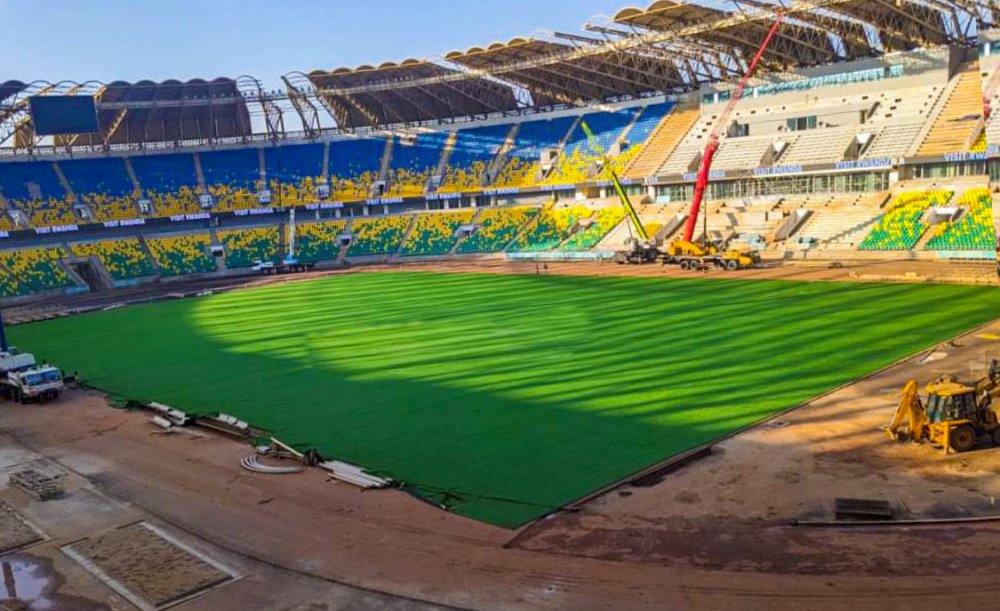 Ubu bwatsi bw’ubukorano buje bukurikira intebe na zo ziri gushyirwamo, hakaba hategerejwe no gutunganya umwanya wo gukoreramo siporo yo gusiganwa ku maguru izaba izengurutse ikibuga.