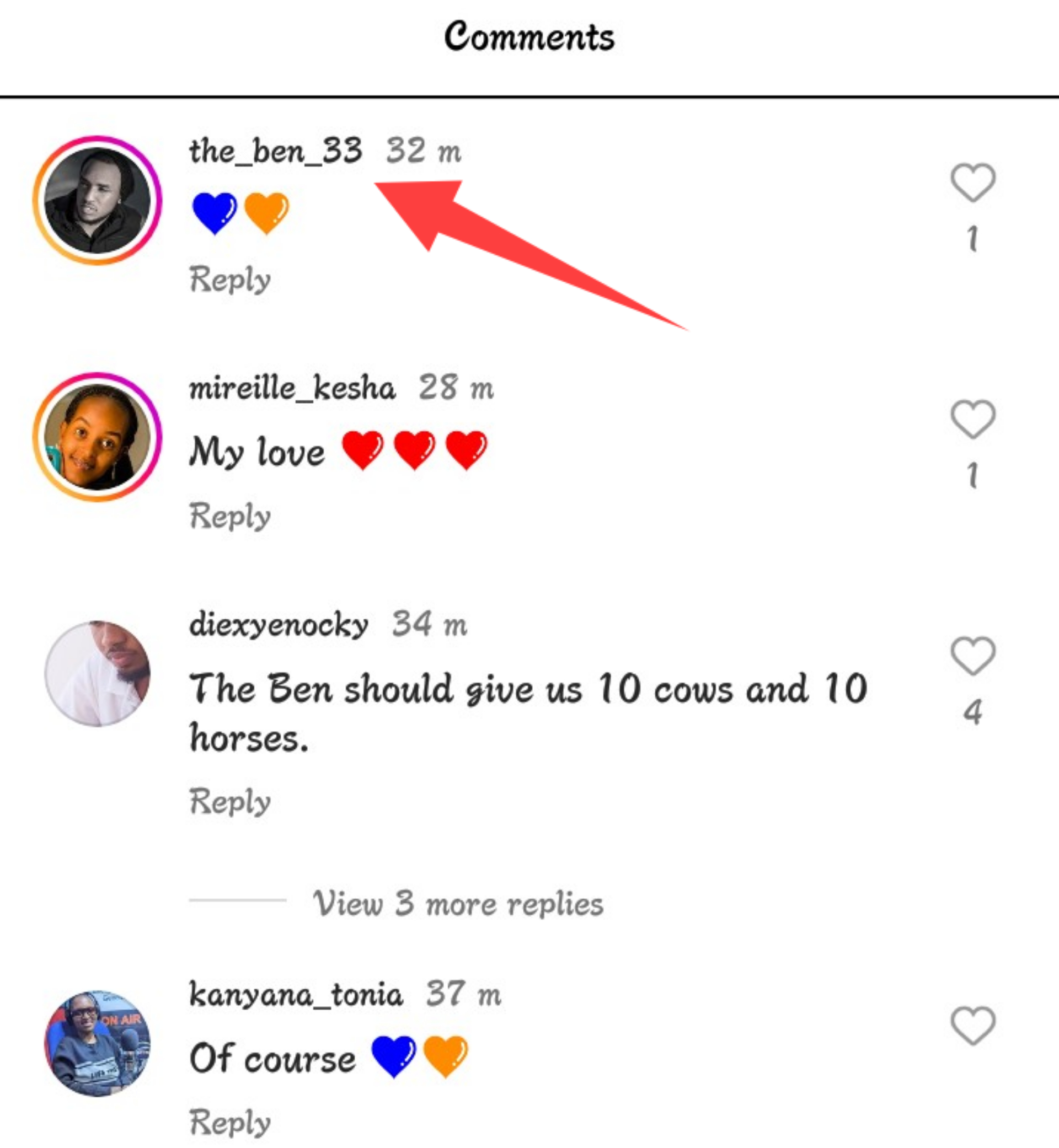 Akimara gushyiraho iyi foto, umugabo we ‘The Ben’ yahise aza aho batangira ibitekerezo, ari uwa mbere ahita ashyiraho udutima 2.