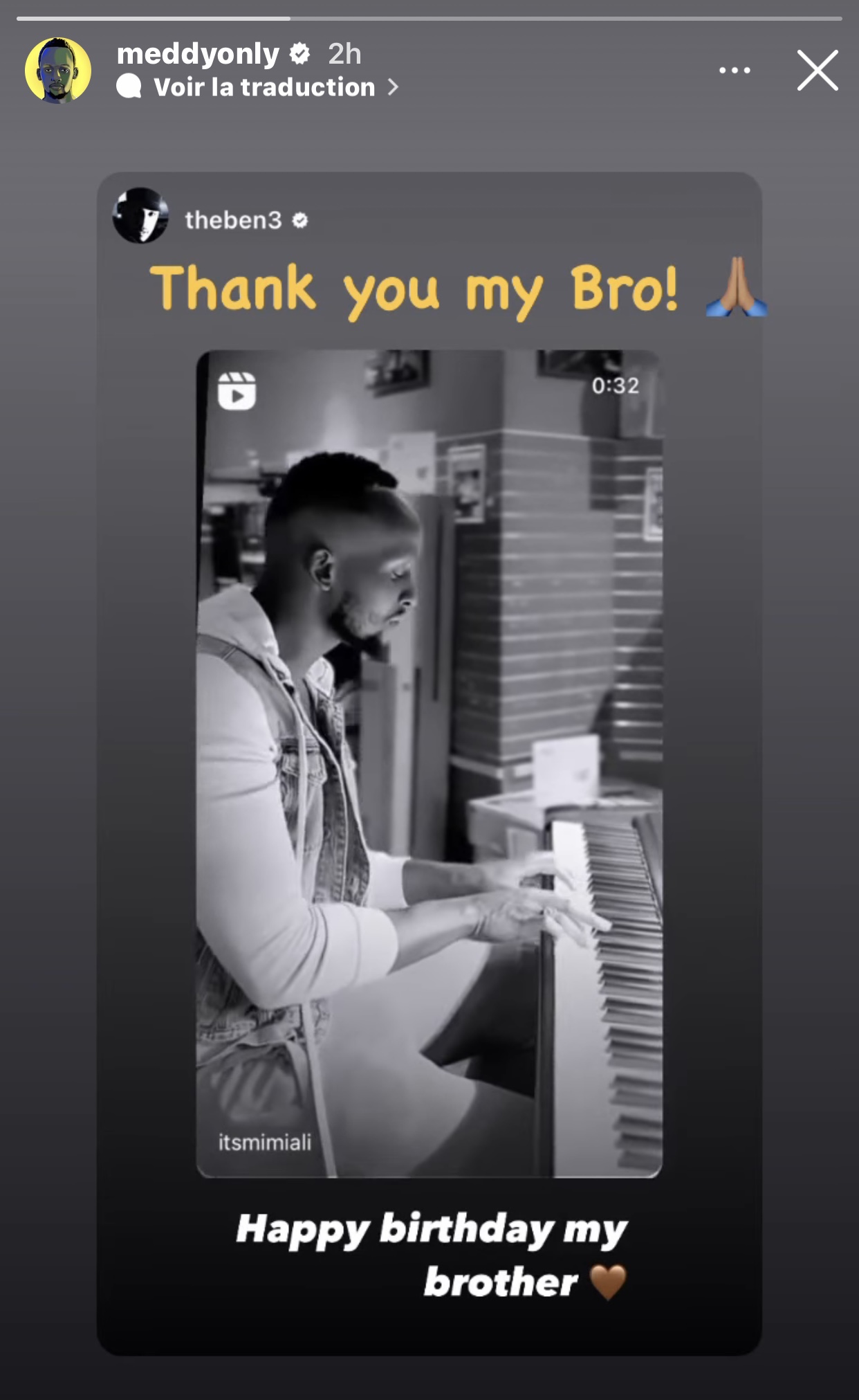 Umuhanzi The Ben akaba n’umwe mu nshuti z’akadasohoka za Meddy nawe ntabwo yigeze abura icyo abwira Meddy. The Ben abinyujije kuri story ya instagram ye yashyize hanze videwo ya Meddy maze ayiherekesha amagambo agira ati « Happy birthday my brother 🤎 ». Ugenekereje mu Kinyarwanda bishatse kuvuga ngo « Isabukuru nziza Muvandimwe wanjye 🤎 ».