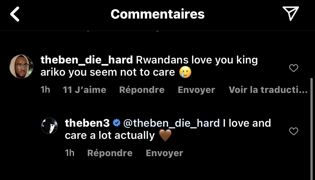 Umwe mu bafana be ukoresha amazina ye The Ben die hard yahise amubaza mu magambo agira ati « Rwandans love you king ariko you seen not to care 🥲 ». Ugenekereje mu Kinyarwanda bishatse kuvuga ngo « Abanyarwanda baragukinda Mwamk ariko ushobora kuba utabyitaho.