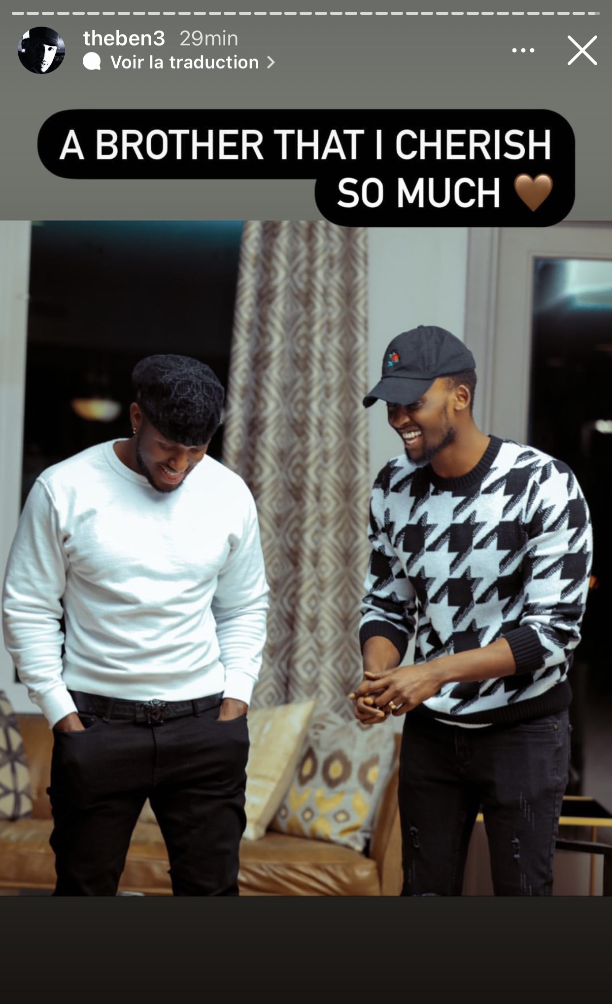 Sibyarangiriye aha kuko The Ben yashyize hanze indi foto kuri story ya instagram ye ari kumwe na Meddy maze ayiherekesha amagambo agira ati « A brother that I cherish so much🤎 ».