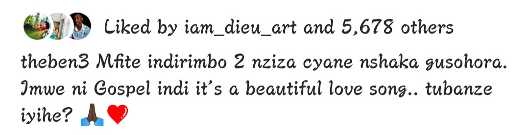 Ahagana saa sita zo kuri uyu wa Gatatu tariki 11 Ukwakira 2023, The Ben yanditse kuri konti ye ya Instagram avuga ko afite indirimbo ebyiri nziza cyane zarangiye. Imwe ni indirimbo y’urukundo, indi ni indirimbo ihimbaza Imana.
