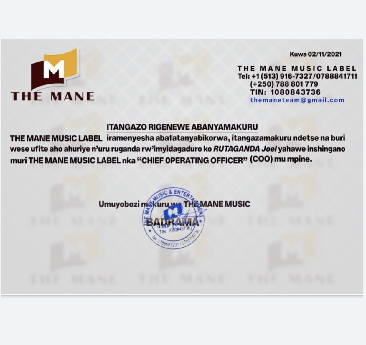 Ubuyobozi bwa THE MANE bumaze gutangaza ko bwamaze kubona umuyobozi mushya. Mu itsngazo rigenewe abanyamakuru ubuyobozi bwa THE MANE bumaze gushyira ahagaragara mu masaha make ashize bwagaragaje ko Rutaganda Joël ariwe wabaye COO (Chief Operating Officer) mushya wa THE MANE. Iri tangazo ryashyizweho umukono na Baadrama.