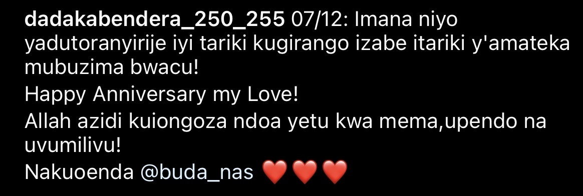 Tidjara Kabendera yagize ati « Imana niyo yadutoranyirije iyi tariki kugiranho izabe itariki y’amateka mubuzima bwacu! Happy Anniversary my Love! Allah azidi kuiongoza ndoa yetu kwa mema,upendo na uvumilivu! Nakuoenda @buda_nas ❤️❤️».