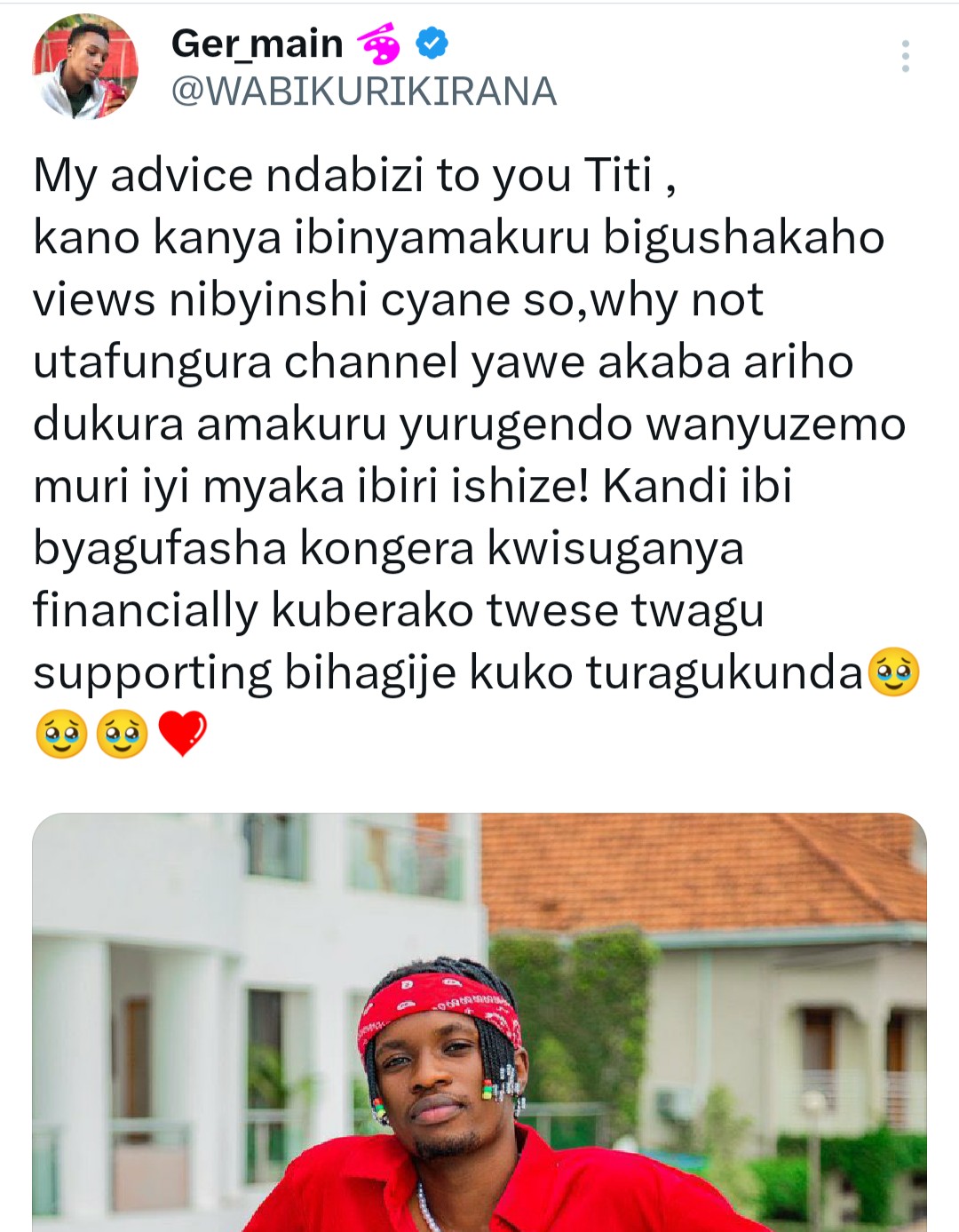 Uyu yagize ati: “My advice ndabizi to you Titi , kano kanya ibinyamakuru bigushakaho views nibyinshi cyane so,why not utafungura channel yawe akaba ariho dukura amakuru yurugendo wanyuzemo muri iyi myaka ibiri ishize! Kandi ibi byagufasha kongera kwisuganya financially kuberako twese twagu supporting bihagije kuko turagukunda.”