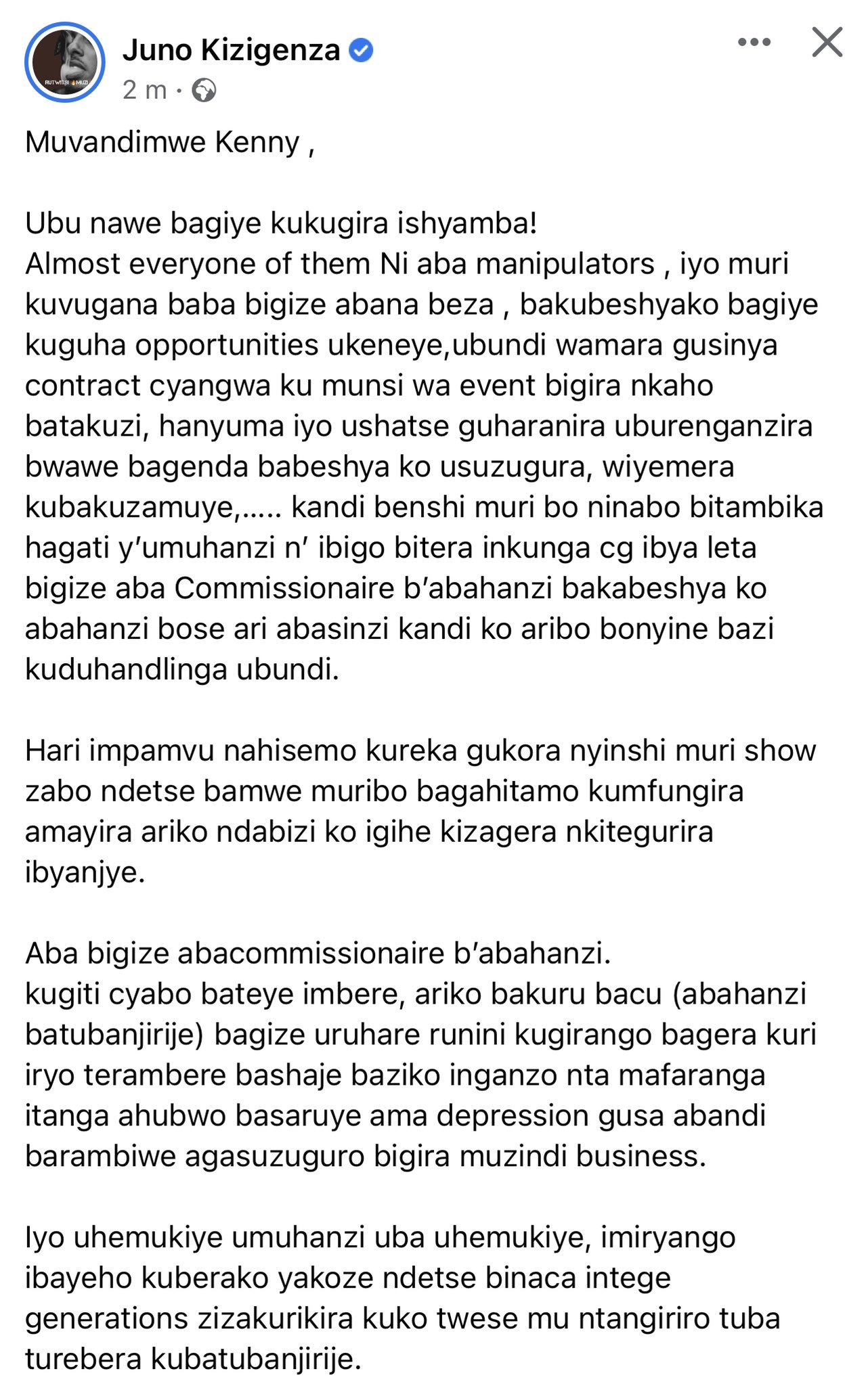 Juno Kizigenza nawe yunze murya mugenzi kenny sol maze yandika ibaruwa ndende avuga ku mitegurire mibi y’ibitaramo mu Rwanda.
