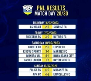 Mu mpera z’icyumweru gishize kuva kuwa Kane kugeza ku Cyumweru mu masitade atandukanye yo mu Rwanda haberaga imikino itandukanye y’umunsi wa 20 wa shampiyona y’ikiciro cya mbere mu mupira w’amaguru mu Rwanda.