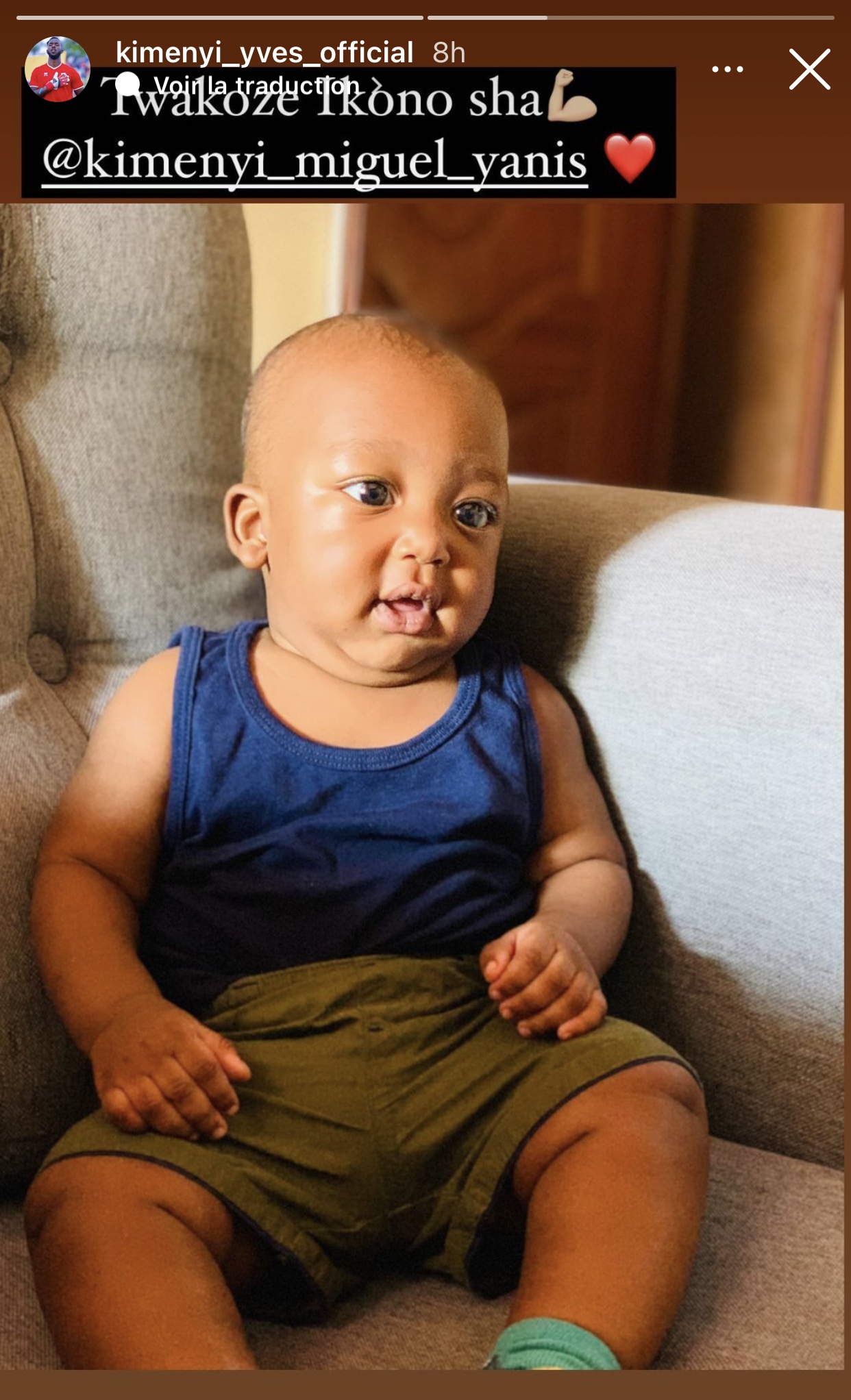 Kimenyi Yves abinyujije kuri story ye ya instagram yashyize hanze ifoto y’umuhungu we, Kimenyi Miguel Yanis, maze ayiherekesha amagambo agira ati « Twakoze ikono sha 💪🏽». Iyo foto ni iyi ikurikira: