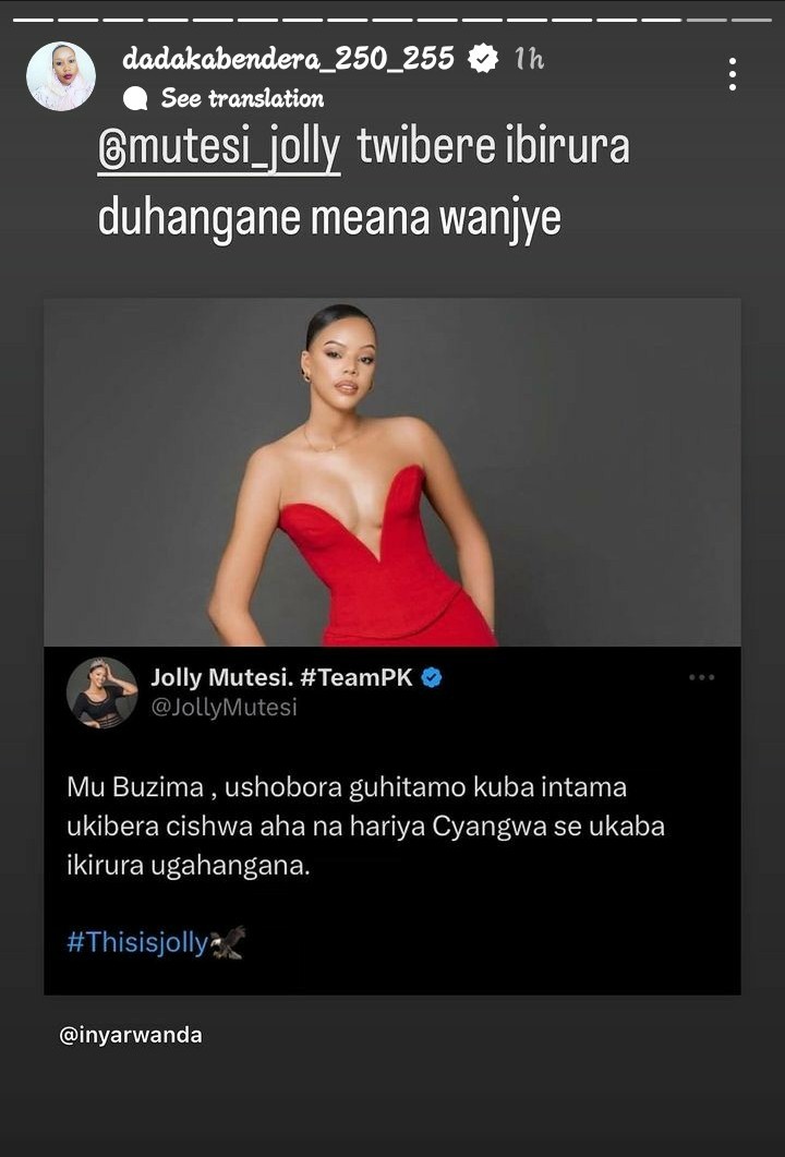 Aya magambo ya Mutesi Jolly yatitije imbuga nkoranya mbaga ndetse bamwe batangira kumusubiza, mu bamusubije harimo na Tijara Kabendera, Tijara yagize ati ” twibere ibirura duhangane meana wanje”.