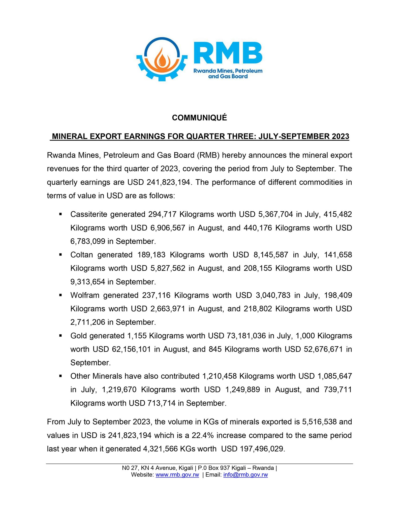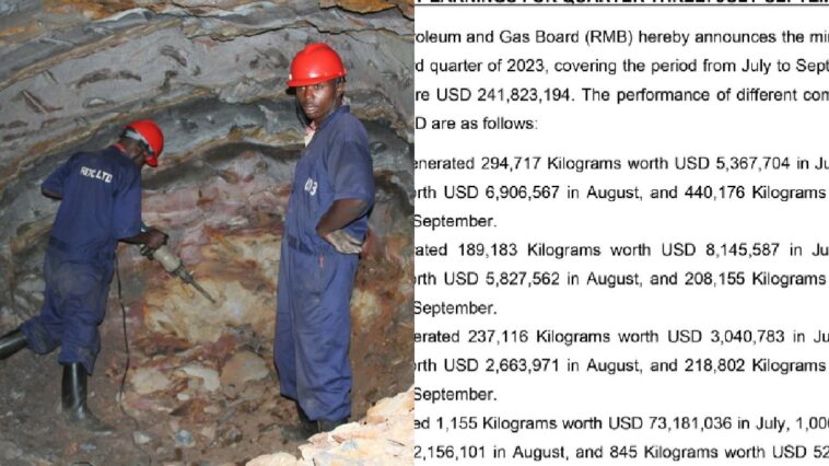 Ikigo cy’Igihugu Gishinzwe Mine, Gaz na Peteroli, RMB cyatangaje ko mu gihembwe cya Gatatu cya 2023, amabuye y’agaciro acukurwa mu Rwanda yinjije arenga miliyoni 241$.
