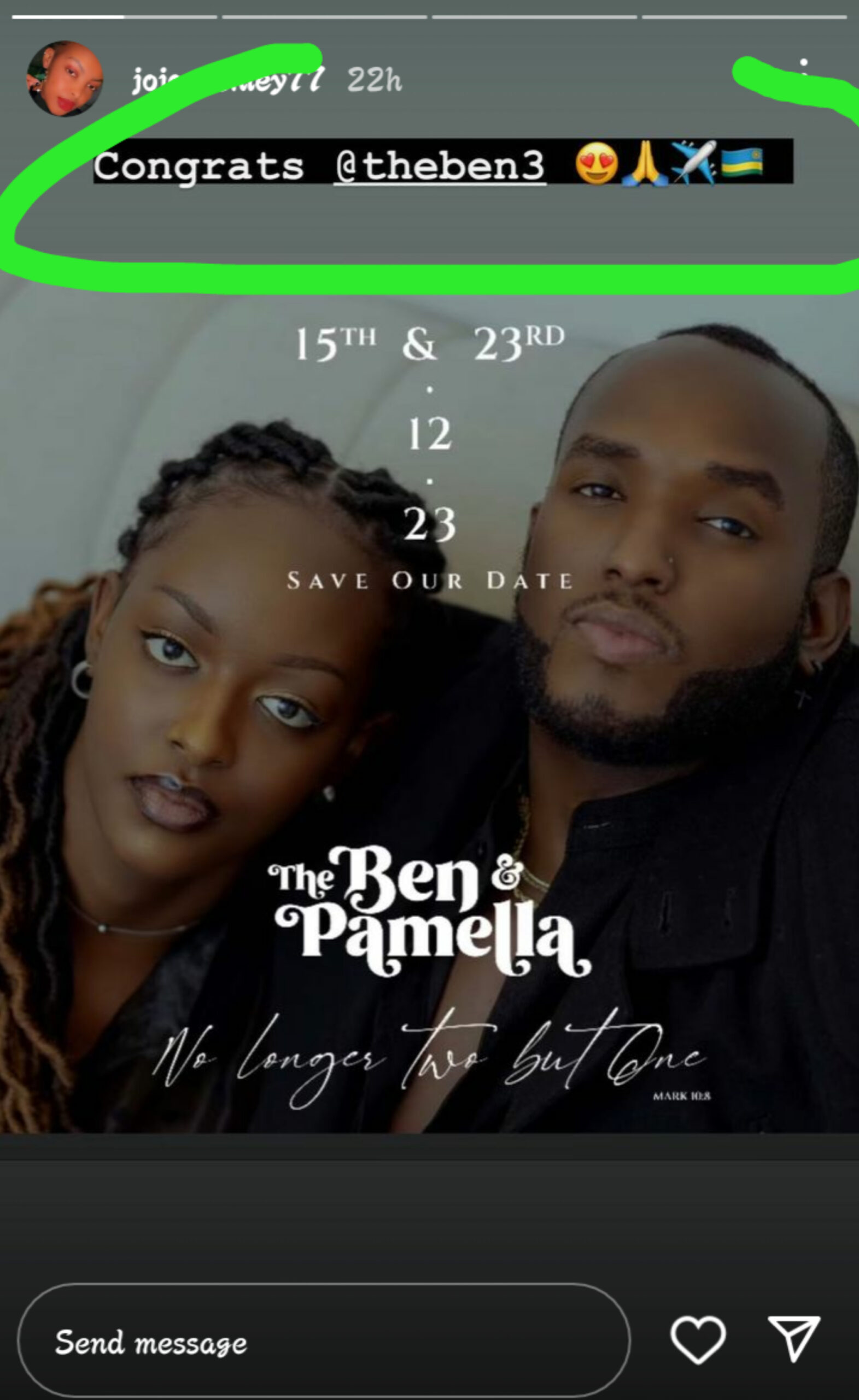 Abinyujije ku rukuta rwe rwa Instagram yahaye feresitasiyo The Ben na Pamella akoresheje ifoto yabo, gusa kuri tumwe mu tumenyetso yashyizeho, yashyizeho akamenyetso k’indege ndetse n’idarapo ry’u Rwanda.