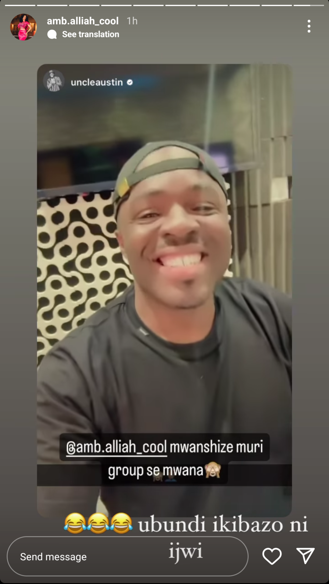 Abinyujije kurukuta rwe rwa Instagram ahashirwa ubutumwa bumara amasaha 24 yashyizeho amashusho ari kumusubiramo maze Alliah Cool nawe amwereka ko ntacyo bikimutwara ahita amubwira ijambo rimwe gusa.