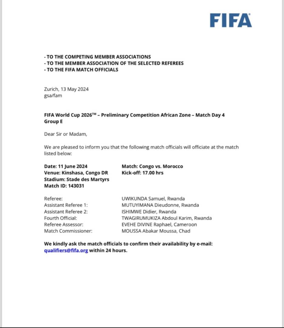 Ishyirahamwe ry’umupira w’amaguru ku isi FIFA ryasohoye itangazo rigaragaza abasifuzi bazasifura umukino uzahuza Congo Brazzavile na Marocco mu mikino yo gushaka tike y’igikombe k’isi 2026.
