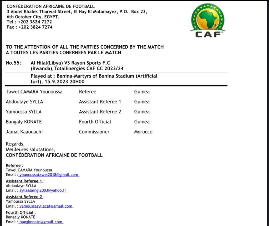 Umusifuzi Younoussa Tawel Camara ukomoka muri Guinea afatanyije na bagenzi be nibo bazayobora umukino wa Al Hilal Bengazi na Rayon Sports tariki 15/09/2023 uyu musifuzi akaba azwiho gukoresha ukuri cyane mu kibuga nk’uko amateka ye abigaragaza.