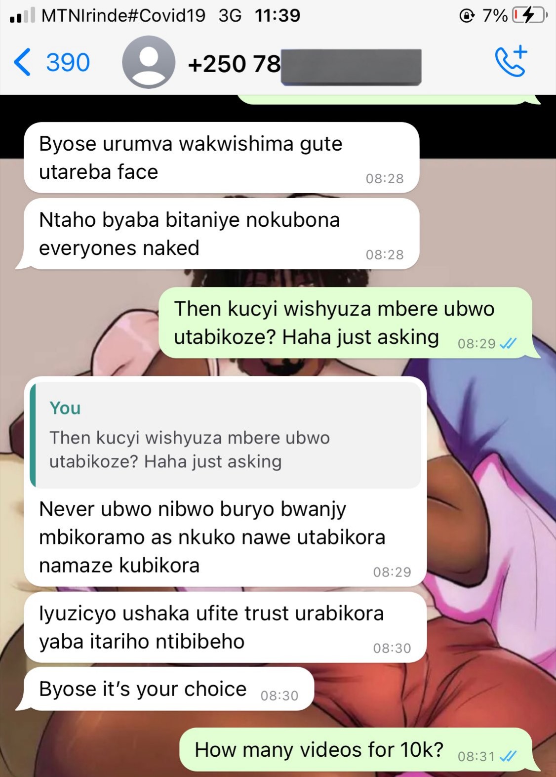 Ubwo ikiganiro cyakomeje kujya mbere umukobwa yeruye avuga igiciro cy’amafaranga yakwemera kugira ngo yemere gutanga amashusho ye yambaye ubusa, amafaranga bemeranyije ni ibihumbi 10frw ubundi akamuha Videwo 4.