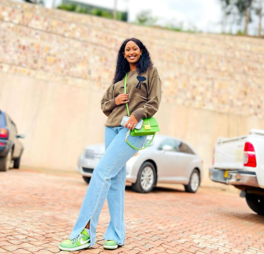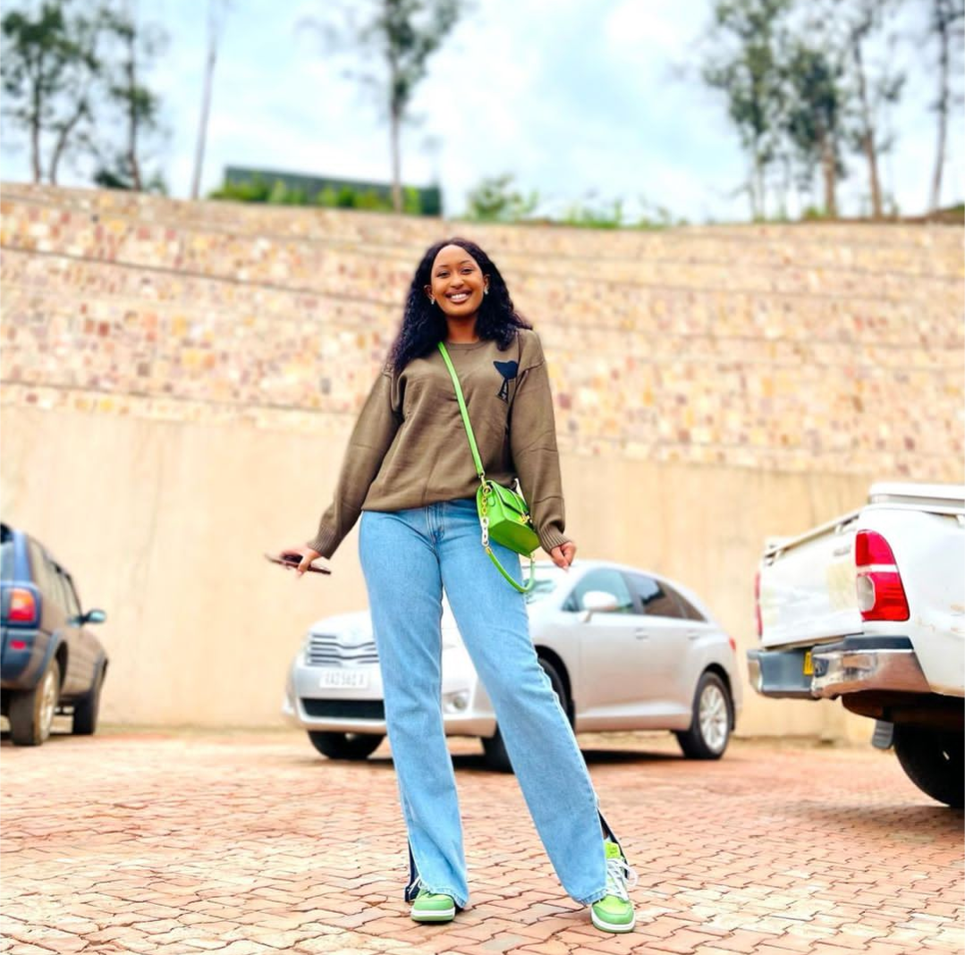 Miss Uwase Muyango wegukanye ikamba rya miss photogenic muri 2019 mw’ipataro y’ikoboyi umupira w’amaboko maremare ndetse n’ishakoshi y’icyatsi afite terefone munoki.