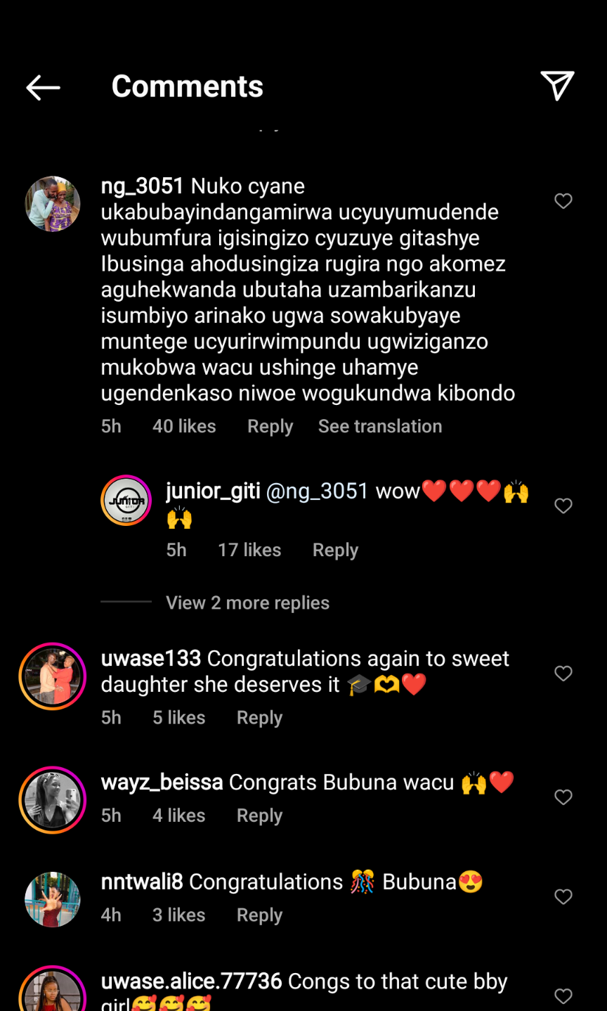 Mu mafoto yashyizwe ku mbuga nkoranyambaga na Junior Giti yagaragaje umukobwa we Bubuna yambaye nk’umuntu usoje amashuri maze agira ati :”Mumfashe tumuhe felicitation (congs) Bye Bye Ikiburamwaka😂😂 Bubuna asoje amashuri yisumbuye y’incuke😂😂”.
