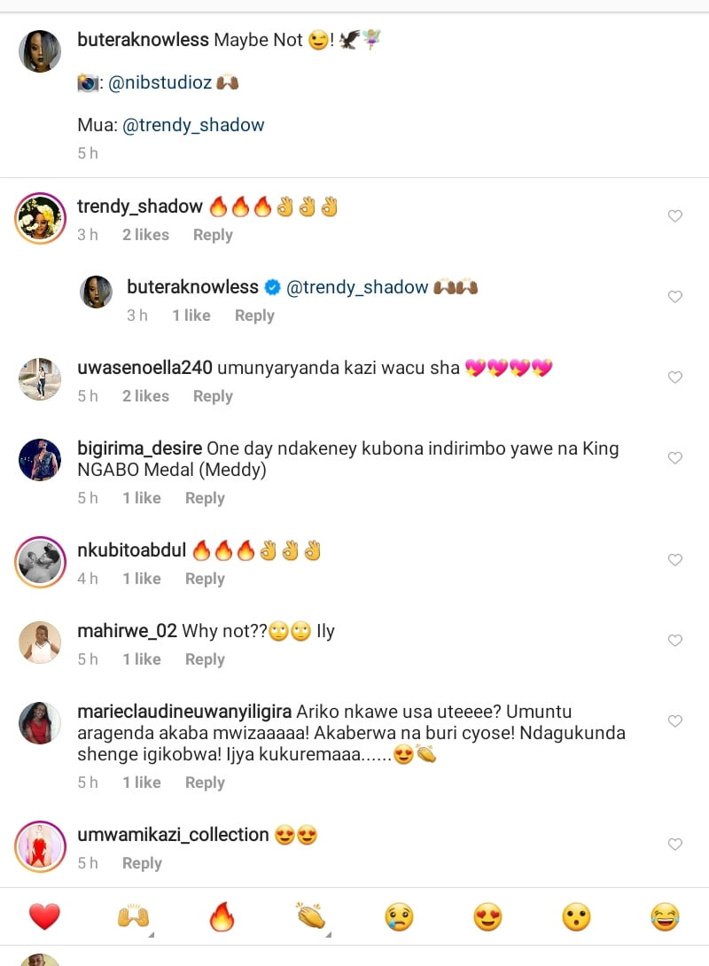 Umwe mu bamukurikira uri instagram yahise amubaze ati”Ariko nkawe usa uteeee?Umuntu aragenda akaba mwizaaaa!Akaberwa na buri cyose!Ndagukunda shenge igikobwa!ijya kukuremaaaa….🥰👏”