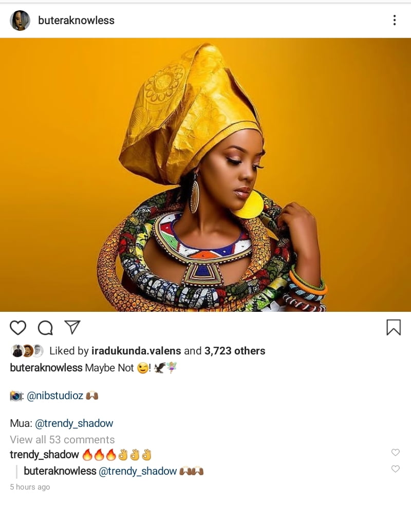 Ni nyuma y’aho uyu muhanzikazi yaramaze gushyira hanze ifoto ye kuri instagram agaragara mu myambarire idasanzwe ya Kinyafurika maze yandikaho ati”Maybe not”‘ bishatse kuvuga ngo ”Birashoboka ko byaba oya