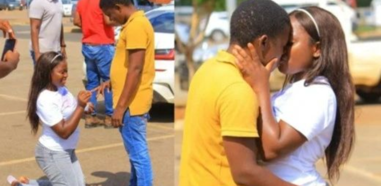 Ntabwo ari ibintu bikunze kubaho kenshi, kumva ko abakobwa bashobora kwisanisha n’abakunzi babo bagapfukama bakabatungura bakabasaba ko bazababera abagabo. Umukobwa wabikoze agaterera ivi mu muhanda yabereye abantu isomo, abandi bamuha urwamenyo