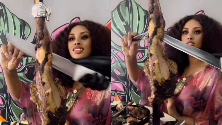 “Ubwo wabona atari agatako k’imbwa uri kurya” Amashusho ya Alliah Cool ari kurya akaguru k’ihene akomeje gutera benshi amapfa – videwo