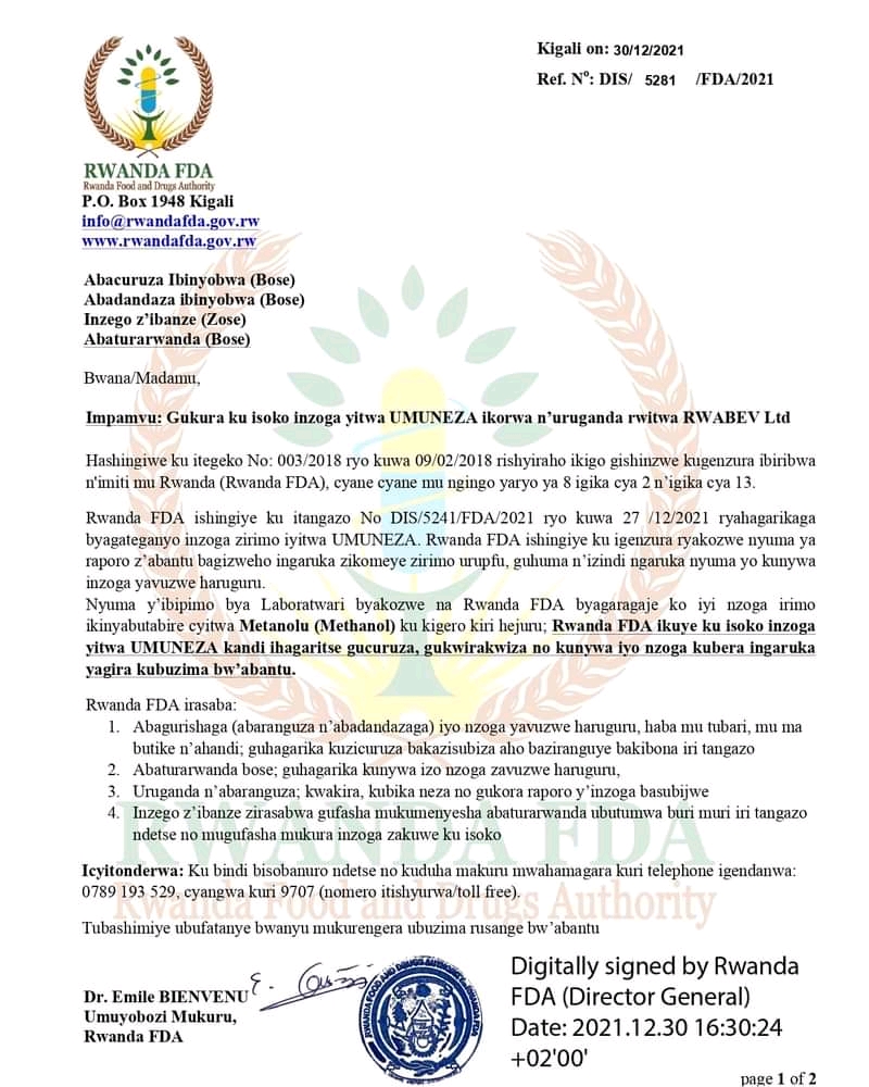 Nyuma y’aho abantu bagera ku munani bahitanywe na bumwe mu bwoko bw’inzoga z’inkorano mu Rwanda, kuri ubu RwandaFDA yavanye ku isoko inzoga yitwa UMUNEZA ikorwa n’uruganda RWABEV nyuma yaho bigaragaye ko iyi nzoga irimo ikinyabutabire cyitwa methanol ku kigero cyo hejuru nk’uko babitangaje mu itangazo bashyize hanze kuri uyu wa Kane, tariki 30 Ukuboza 2021.