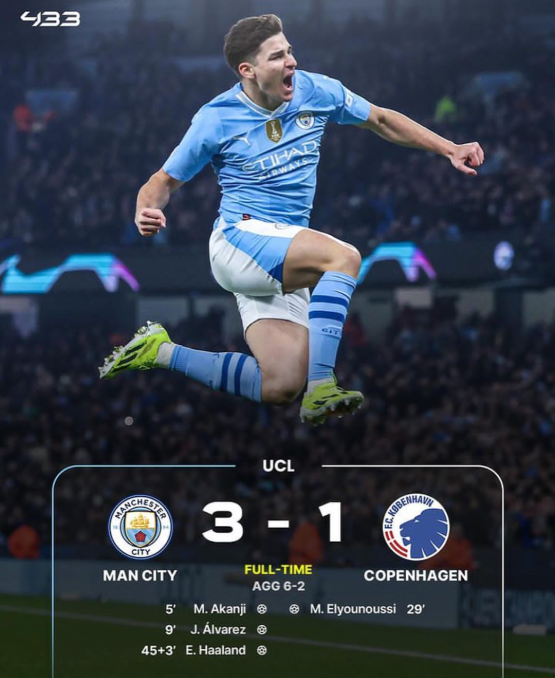 Manchester City yatsindaga Copenhagen ibitego 3-1 byatumye abasore b’umutoza Pep Guardiola bakatisha itike ya 1/4 kugiteranyo cy’ibitego 6-2.