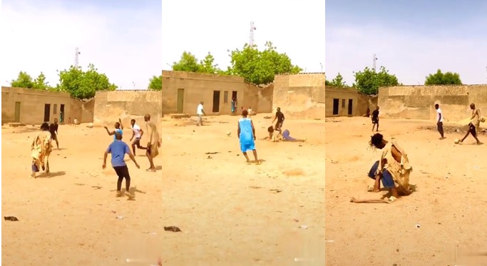 Mu mashusho yo kuri twitter uyu mugabo wari warakaye yagaragaye akina naba bana umupira ,ariko bakajya batera amashoti ,bakamucenga cyane.Ni umukino wari usekeje cyane.Gusa byaje kurangira nabi ubwo uyu mugabo yafatwaga n’umujinya maze abirukankana n’ibiti n’amabuye ashaka kubahemukira.