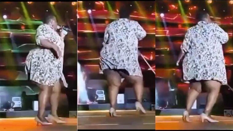 Ni amashusho akomeje kuzenguruka mu bitangazamakuru bitandukanye byo muri Uganda, aho uyu mugore uzwiho kuba abyibushye yaje ku rubyiniro yambaye ikanzu ngufi cyene maze ntiyatinya gukaraga umubyimba.