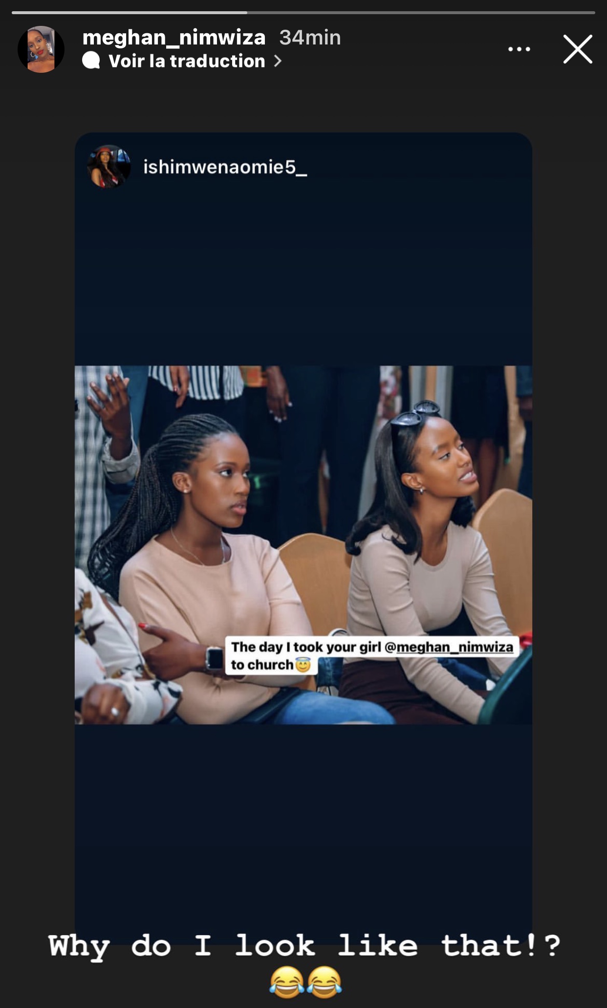Abinyujije kuri story ya instagram ye, Miss Naomie yashyize hanze ifoto aho we na Meghan bari mu rusengero maze ayiherekesha amagambo agira ati « The day I took your girl @meghan_nimwiza to church 😇 ». Miss Meghan akibona iyi foto yahise ayivugaho amagambo agira ati « Why do I look like that?😂😂 ».