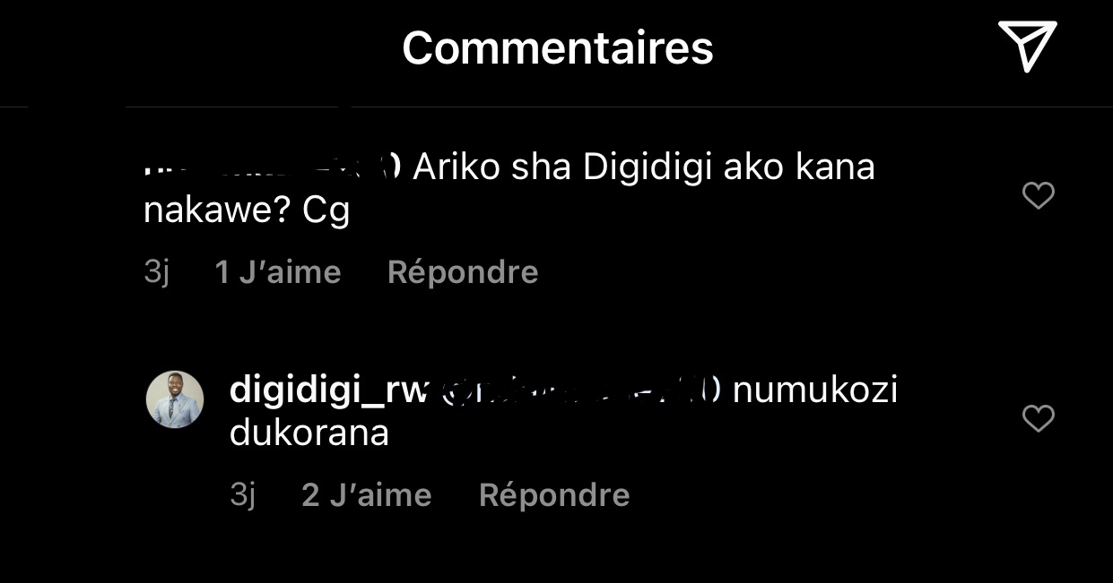 Digidigi yakuyeho urujijo ndetse anatanga ukuri kuri iyi foto mu magambo agira ati « Uyu ni umukozi dukorana ». Ni nyuma yuko umwe mu bafana be yari amaze kumubaza ikibazo kigira kiti « Ariko sha Digidigi ako kana nakawe cg ».