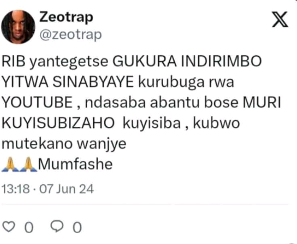 Abinyujiji ku rukuta rwe ra X yagize ati “RIB yantegetse GUKURA INDIRIMBO YITWA SINABYAYE ku rubuga rwa YOUTUBE, ndasaba abantu bose MURI KUYISUBIZAHO kuyisiba , kubwo mutekano wanjye. Mumfashe”