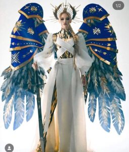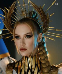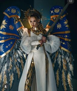 Ubusanzwe uyu mu Miss yitwa Viktoria Apanasenko akaba ariwe uhagarariye Ukraine muri miss universe, Uyu mukobwa yatunguranye cyane ubwo yaserukaga afite inkota, yambaye n’imyambaro ifite amababa. Amafoto