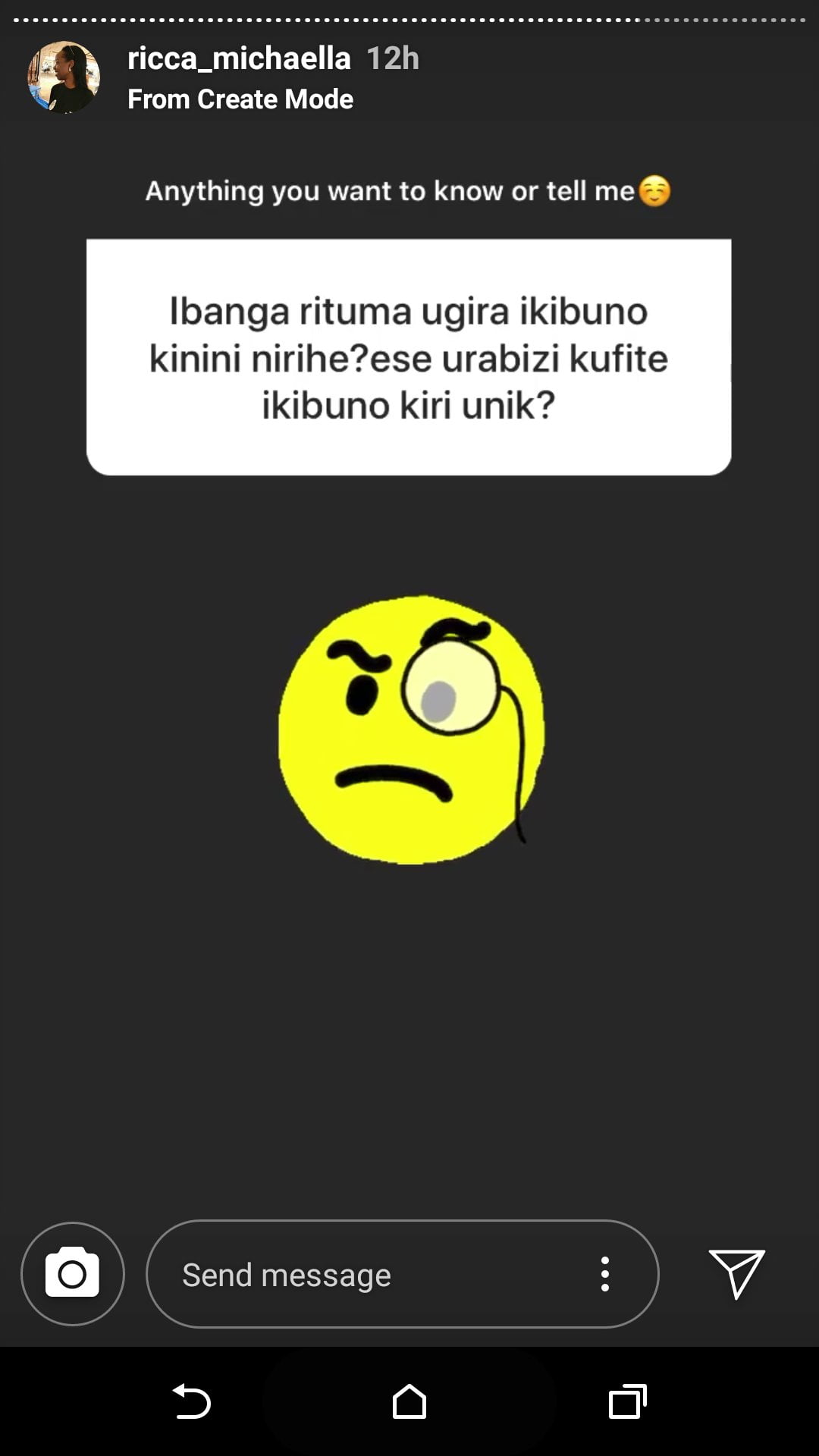 Ricca Michaella akaba yari yasabye kumubaza ikibazo icyaricyo cyose bifuza kumenya kuri nuko umufana ahita amubaza ikibazo kigira giti :”Ibanga rituma ugira ikibuno kinini ni irihe? Ese urabizi ko ufite ikibuno kiri Uniq (kihariye)?”. Ricca akaba yarabuze icyo asubiza ahitamo gushyiraho aka emoji gasobanuye umuntu uri gushakisha.