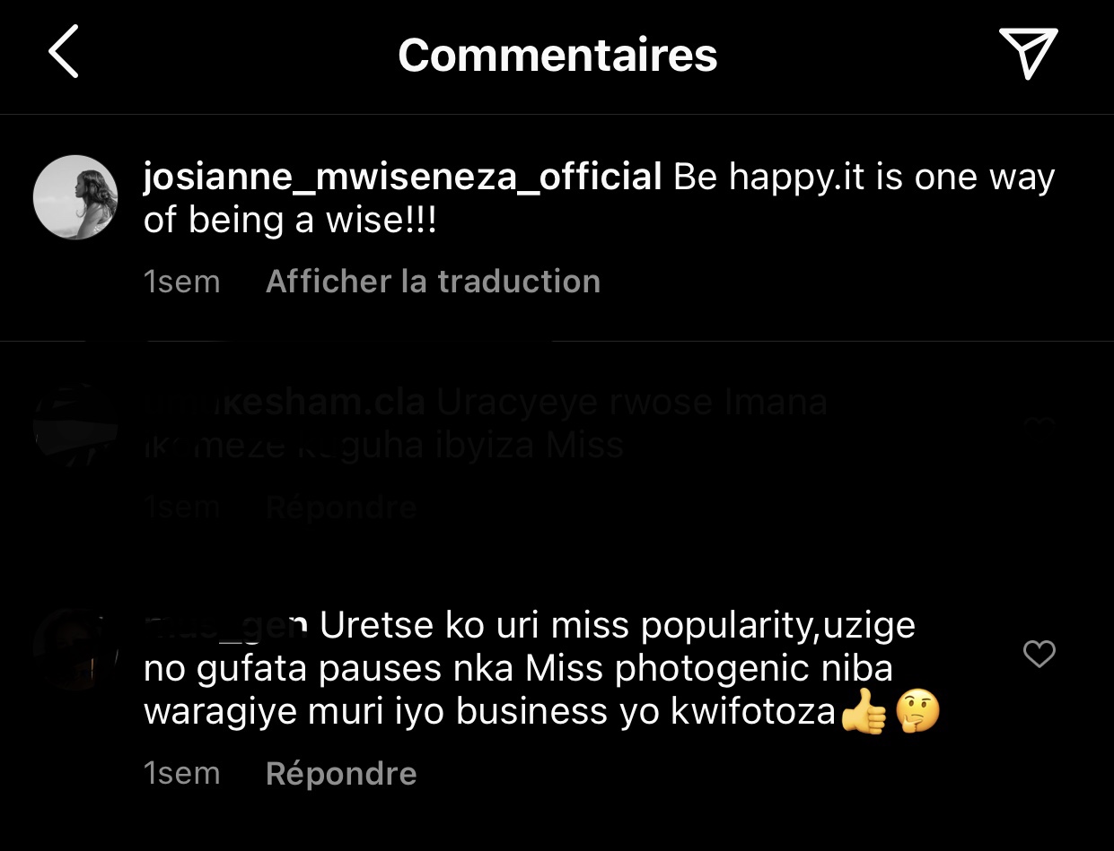 Nyuma yuko Miss Mwiseneza Josiane ashyize hanze iyi foto, umwe nu bafana be yamwandikiye amagambo agira ati « Uretse ko uri Miss popularity uzige no gufata pauses nka Miss Photogenic niba waragiye muri iyo business yo kwifotoza ».