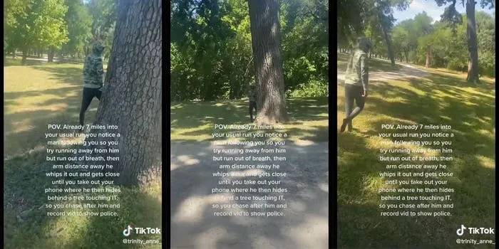 Trinity Hannaway (@trinity_anne_) yashyizeho TikTok yerekana umugabo avuga ko yamukurikiranye yihishe inyuma yigiti kuwa kabiri. Video irerekana umugabo amuhunga; yiruka inyuma ye yumva arira.