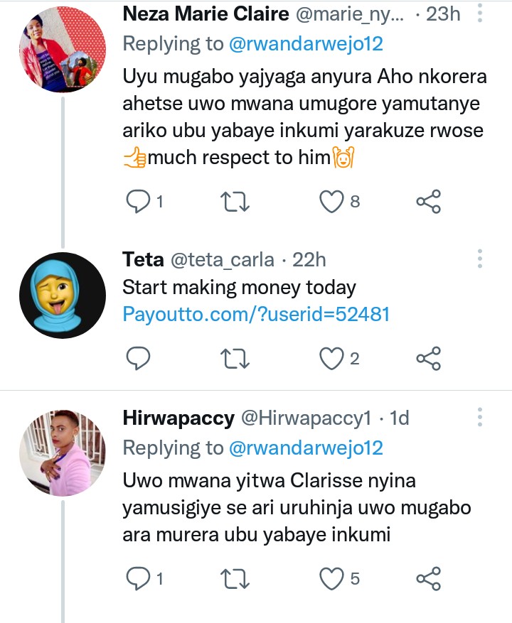 Amakuru avuga ko uyu mugabo umugore we yamutaye, akamutana uyu mwana w’umukobwa aho yagiye uyu mwana akiri uruhinja. Kugeza ubu uyu mwana yamaze gukura ikindi kandi akaba yitwa Clarisse.