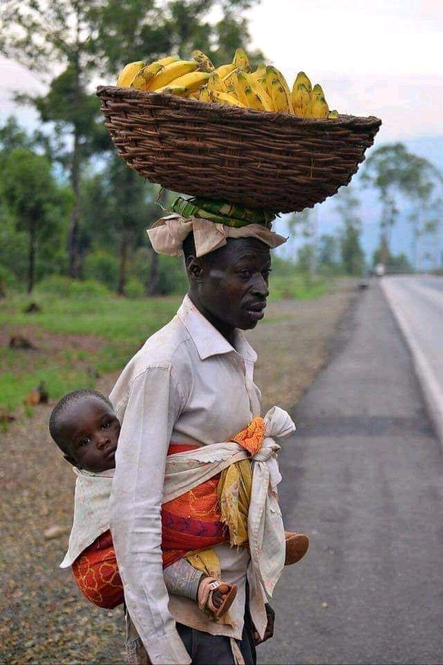 Ni umugabo wagaragaye ahetse umwana w’umukobwa ukiri muto ndetse anikoreye agataro k’imineke ari gushakisha ubuzima. Ibi uyu mugabo yakoze bimenyerewe we cyane ko ari imirimo y’abagore.